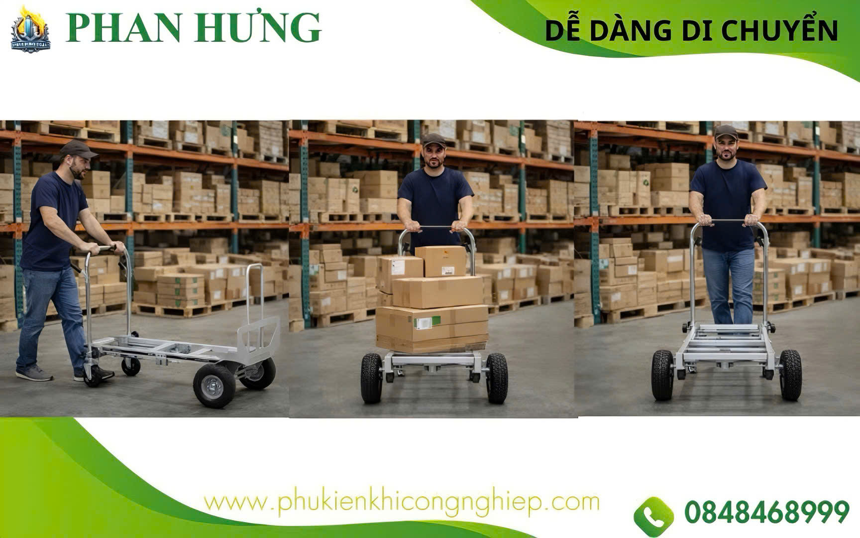 Một chiếc xe đẩy 600kg có thể thay thế 2–3 lao động khi vận chuyển hàng nặng, giảm áp lực công việc và hạn chế chấn thương lưng.